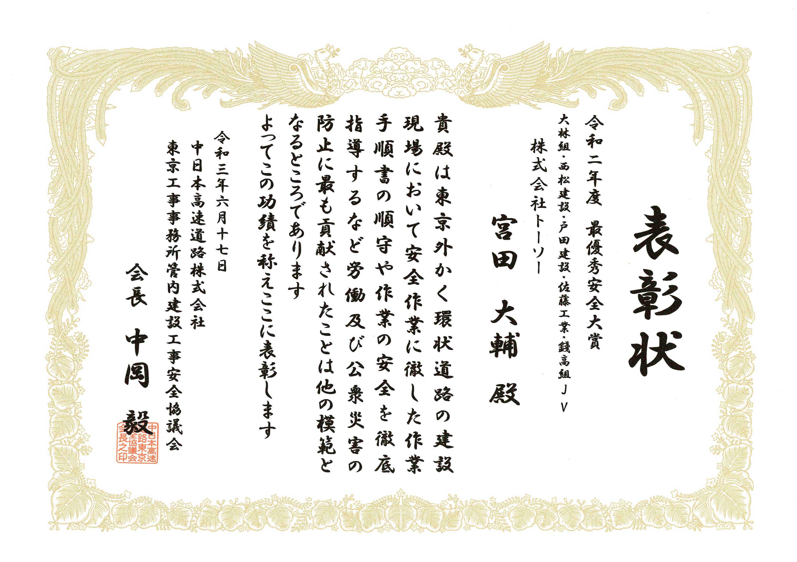 「令和二年度 最優秀安全大賞」の表彰を受けました。