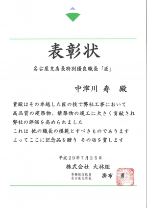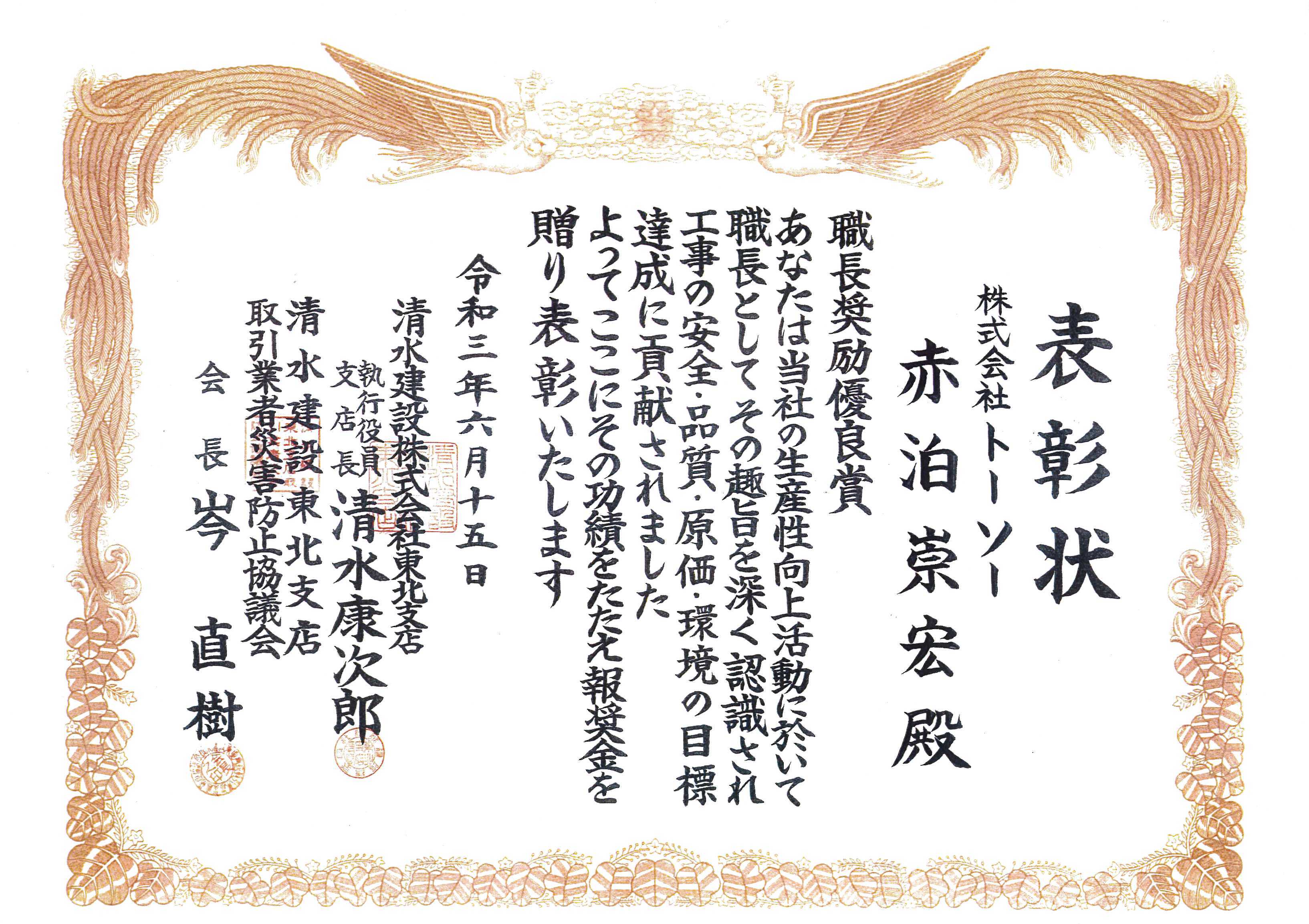 「職長優良奨励賞」の表彰受けました。