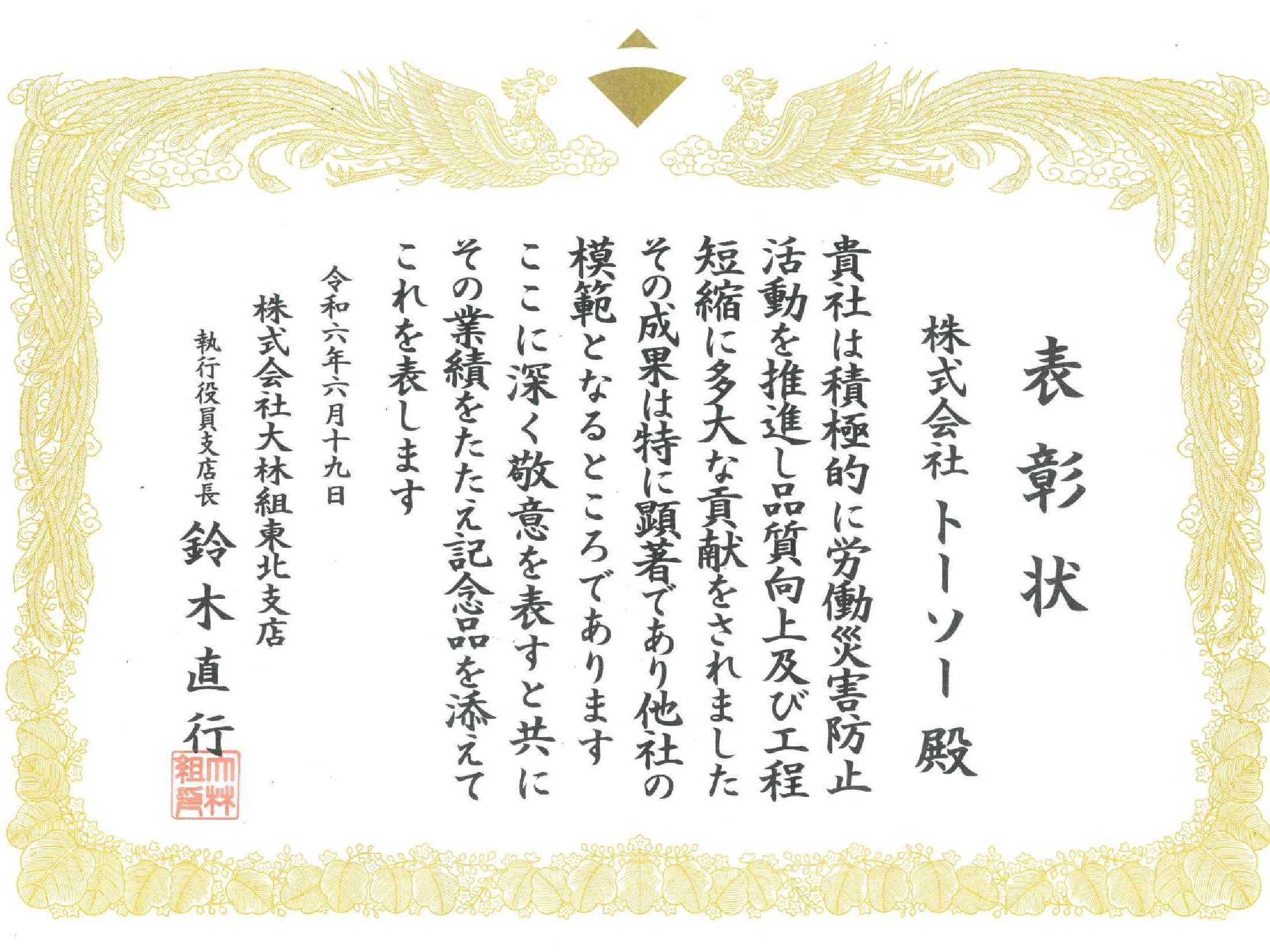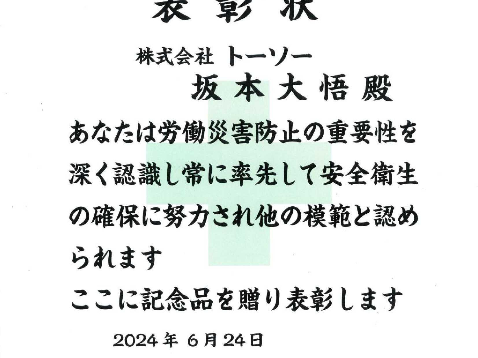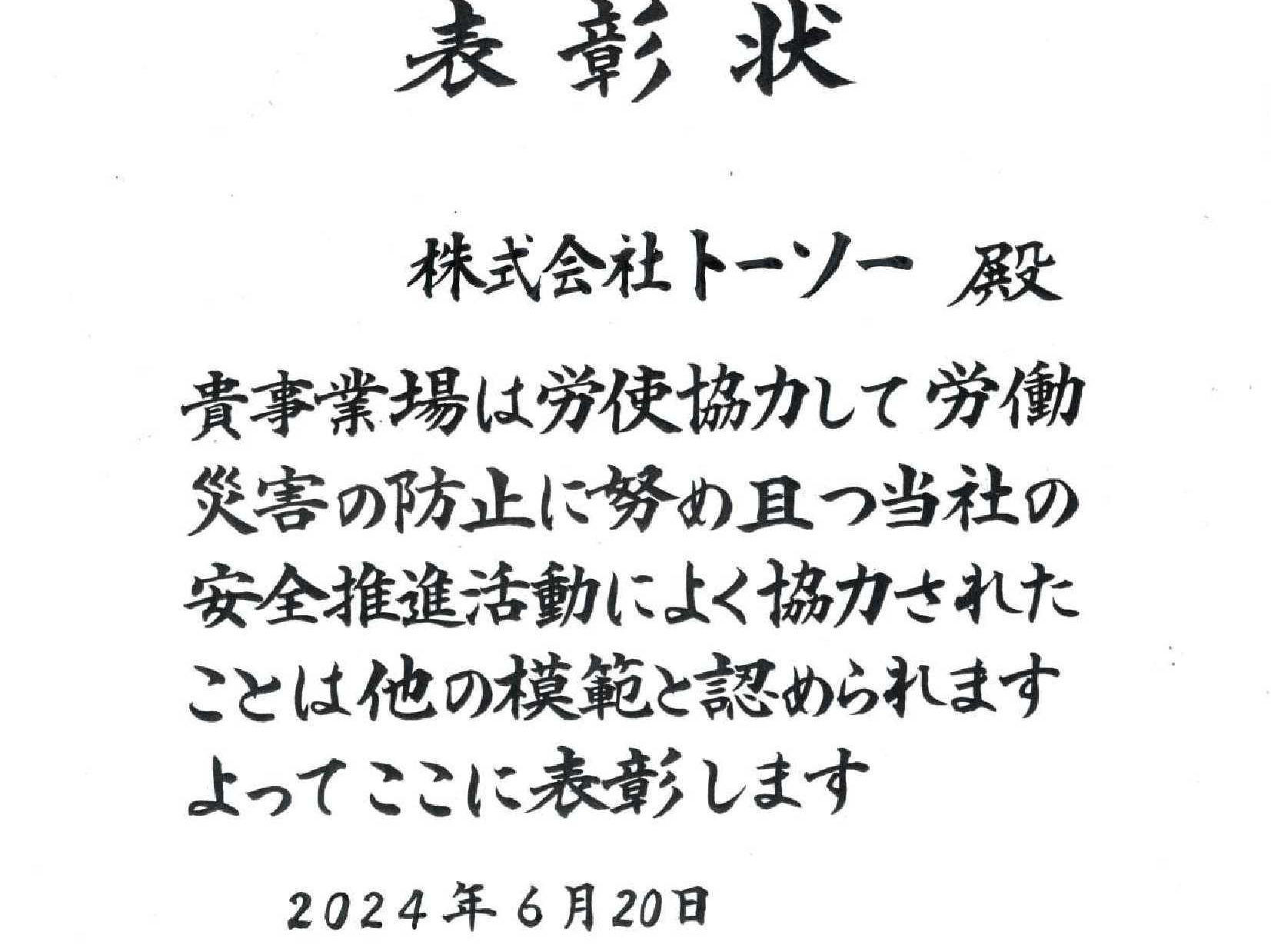 令和6年6月20日「協力会社安全表彰」を頂きました。