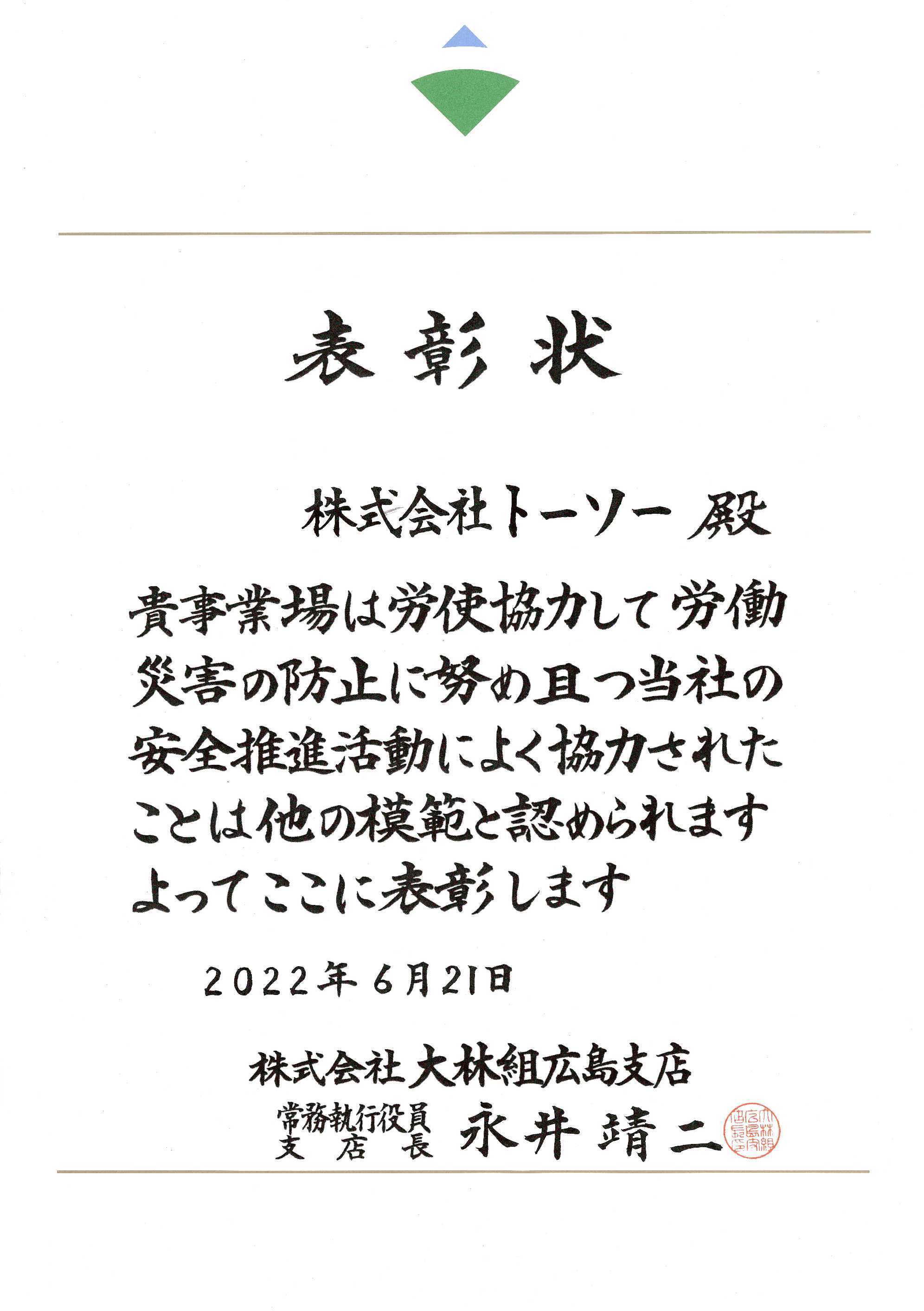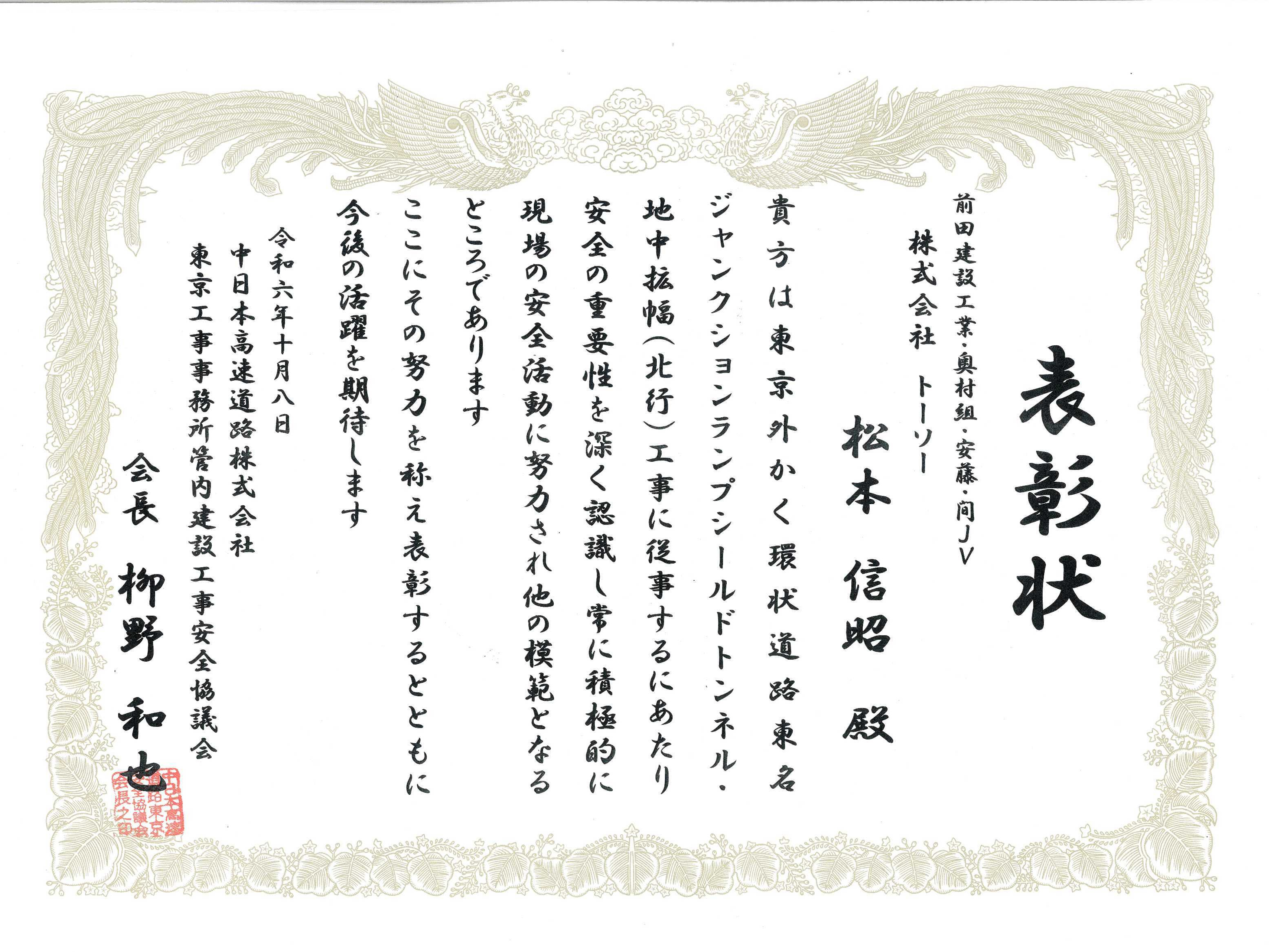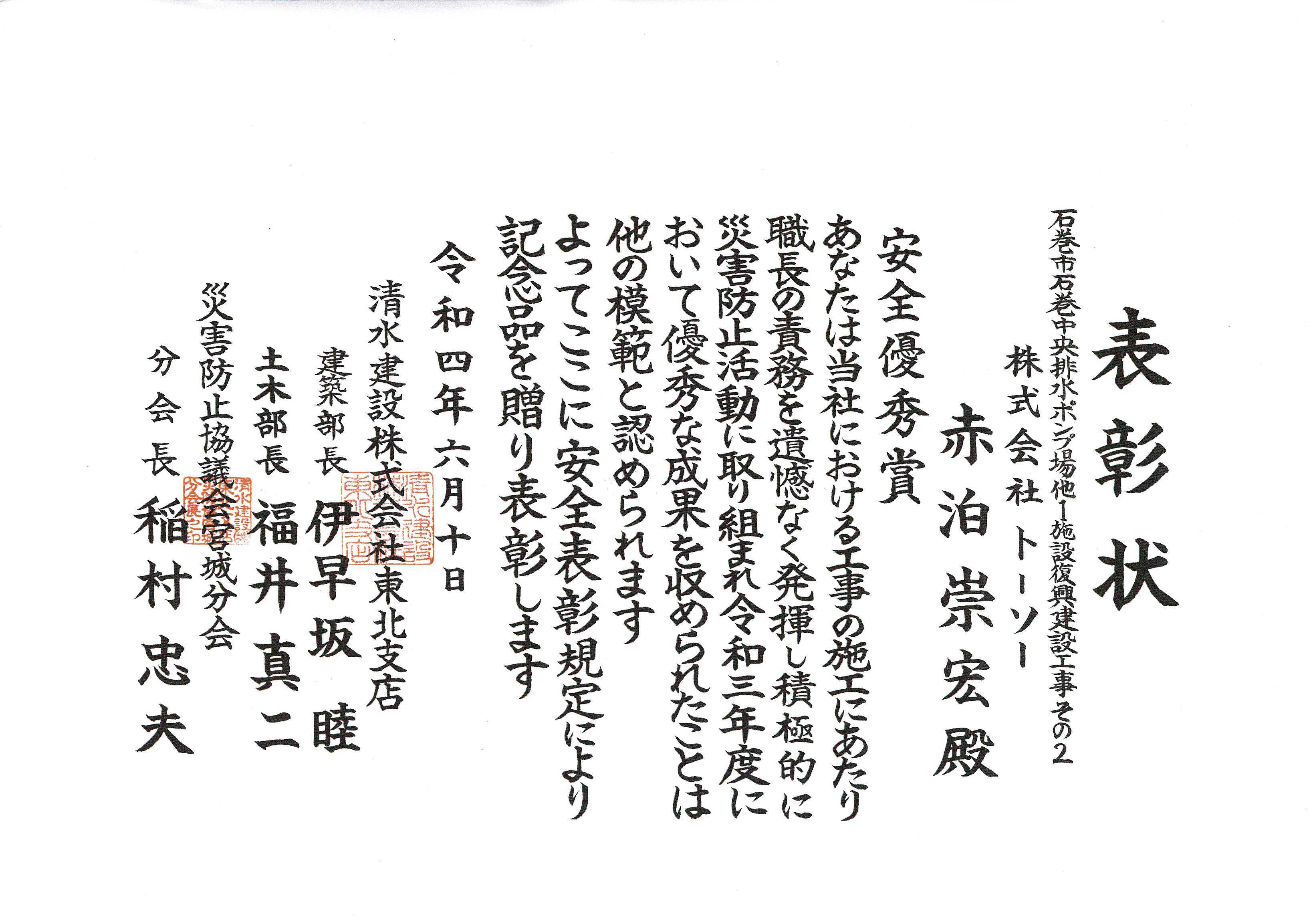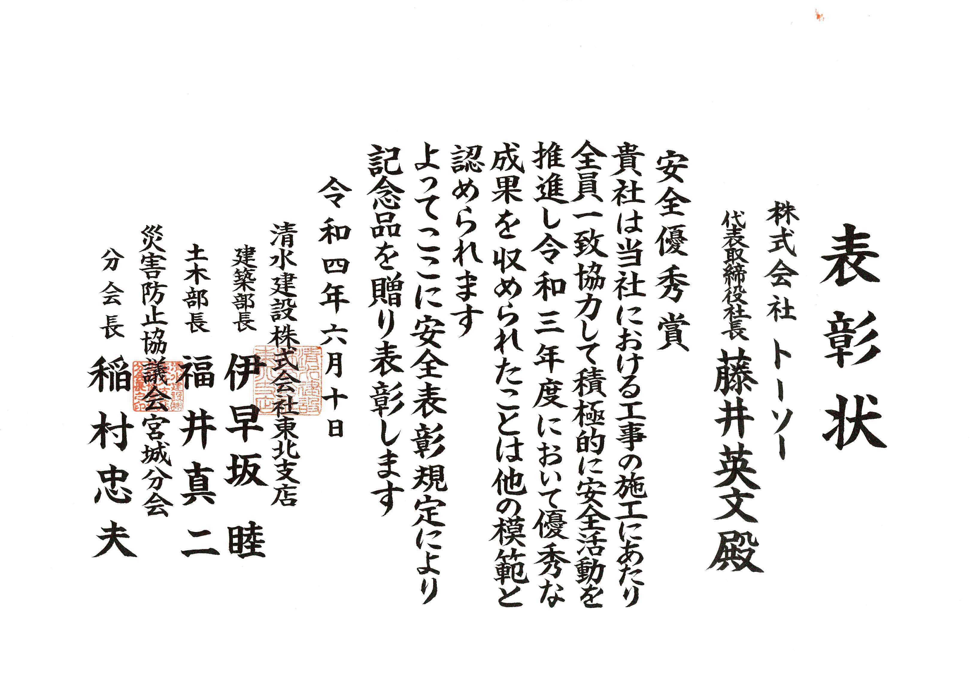 令和6年6月20日「協力会社安全表彰」を頂きました。