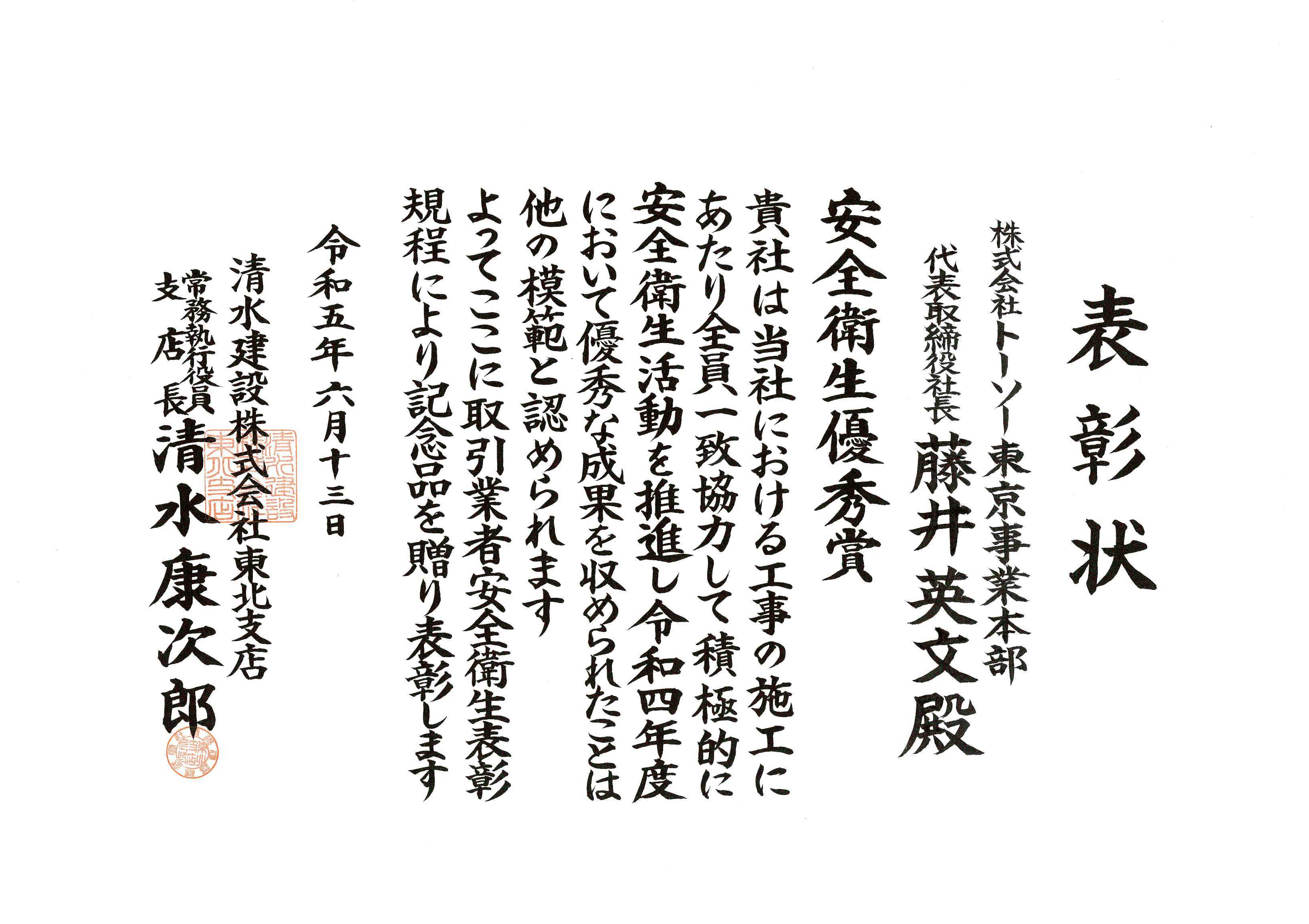 令和5年6月13日 安全衛生優秀賞を受賞しました。