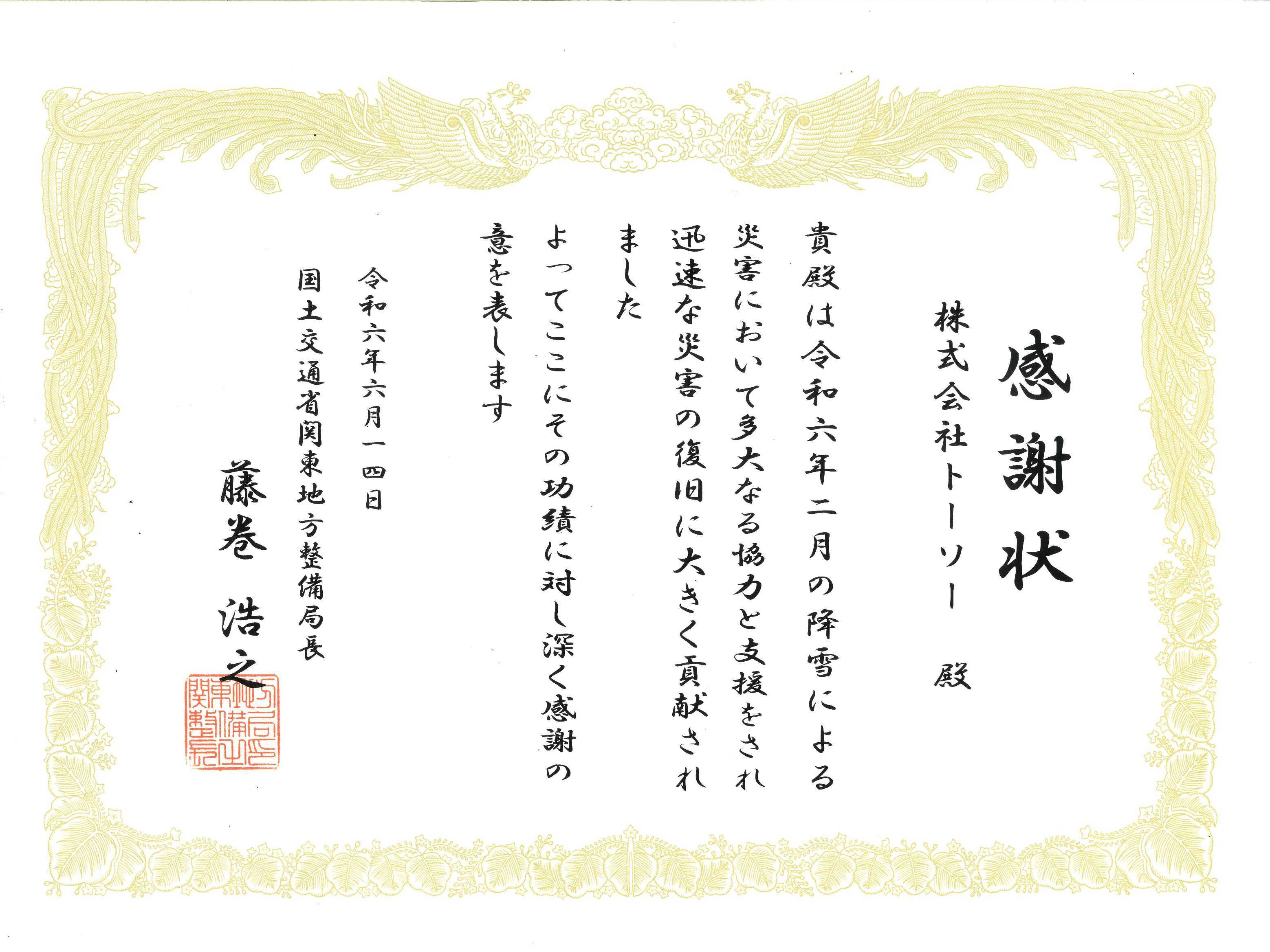 令和6年6月 災害復旧感謝状
