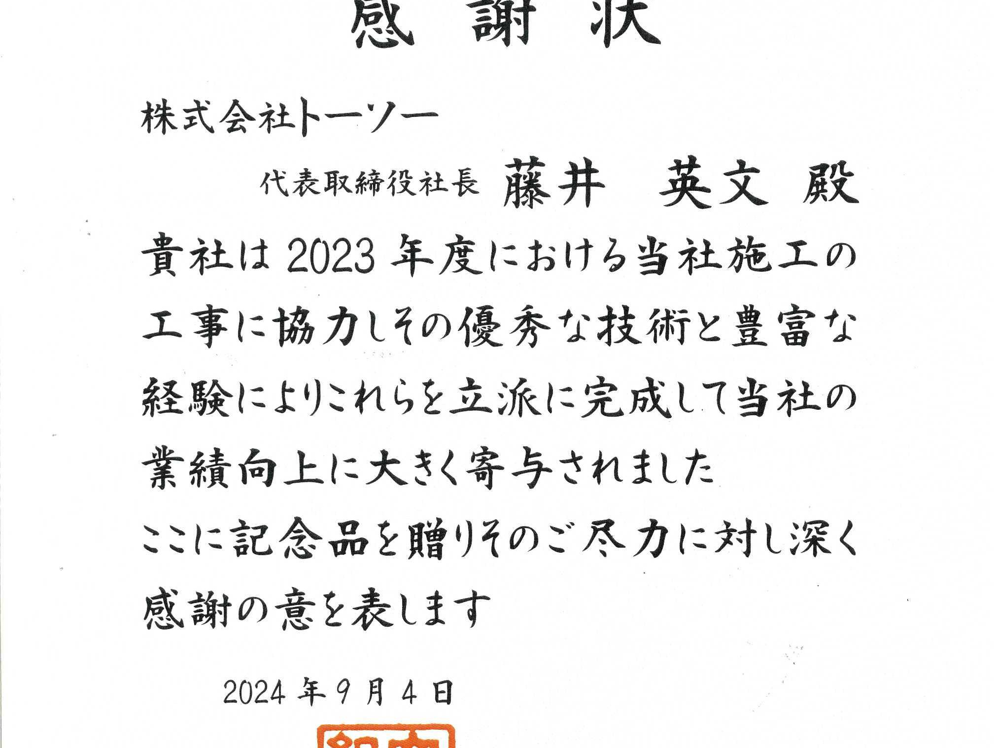 令和6年6月19日「優良協力業者表彰」を頂きました。