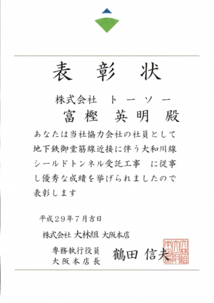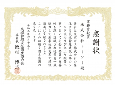 柏崎刈谷原子力発電所様より表彰状を頂きました。