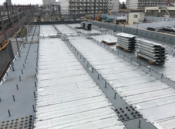 日綜産業㈱にて開発した「QuikDeck(クイックデッキ)」を使用。最大積載荷重350kg/㎡、