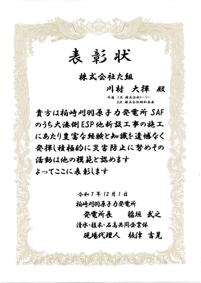 柏崎刈谷原子力発電所様より表彰状を頂きました。